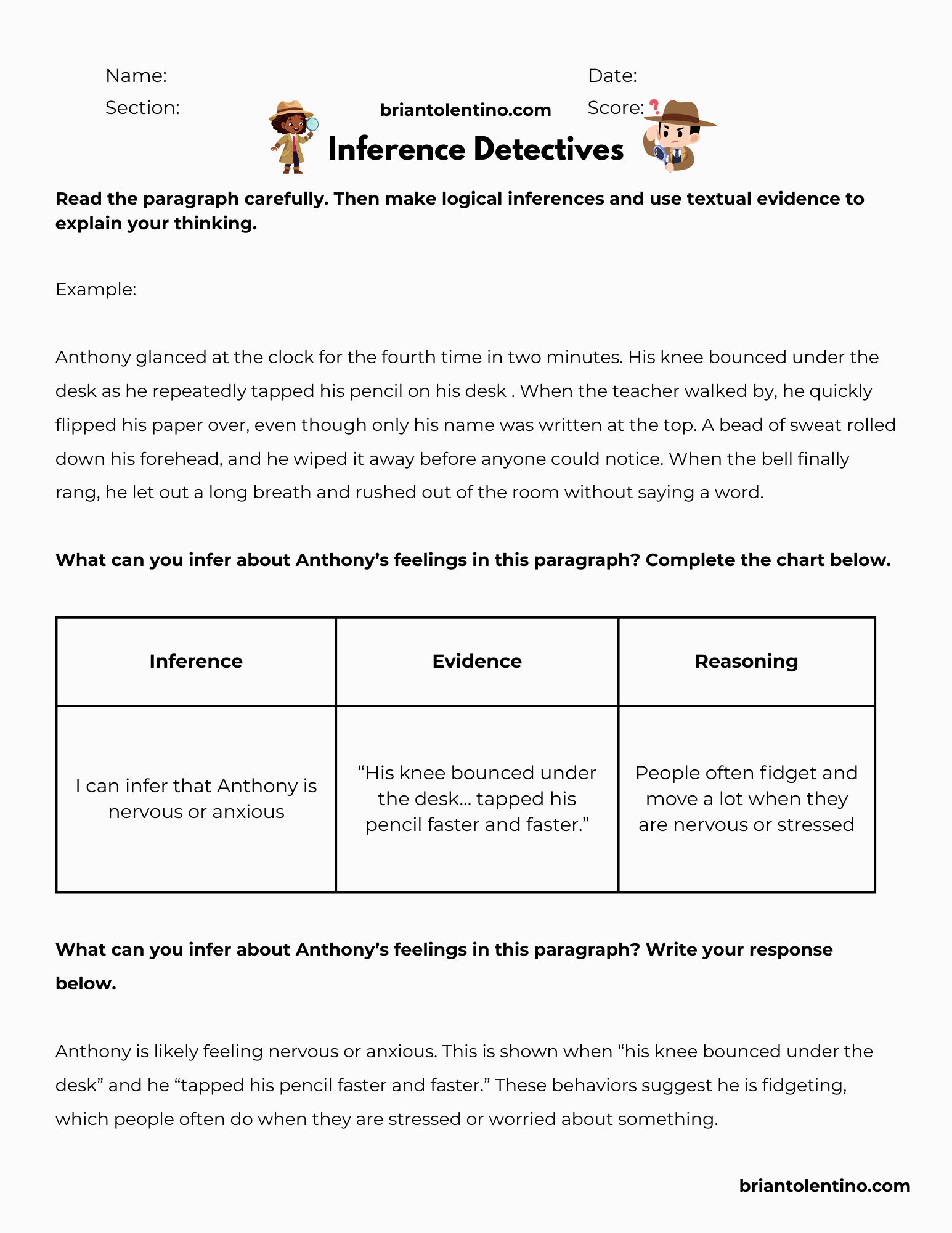 Here is an activity designed to help students practice making inferences and using textual evidence to clearly explain their reasoning. Worksheet: