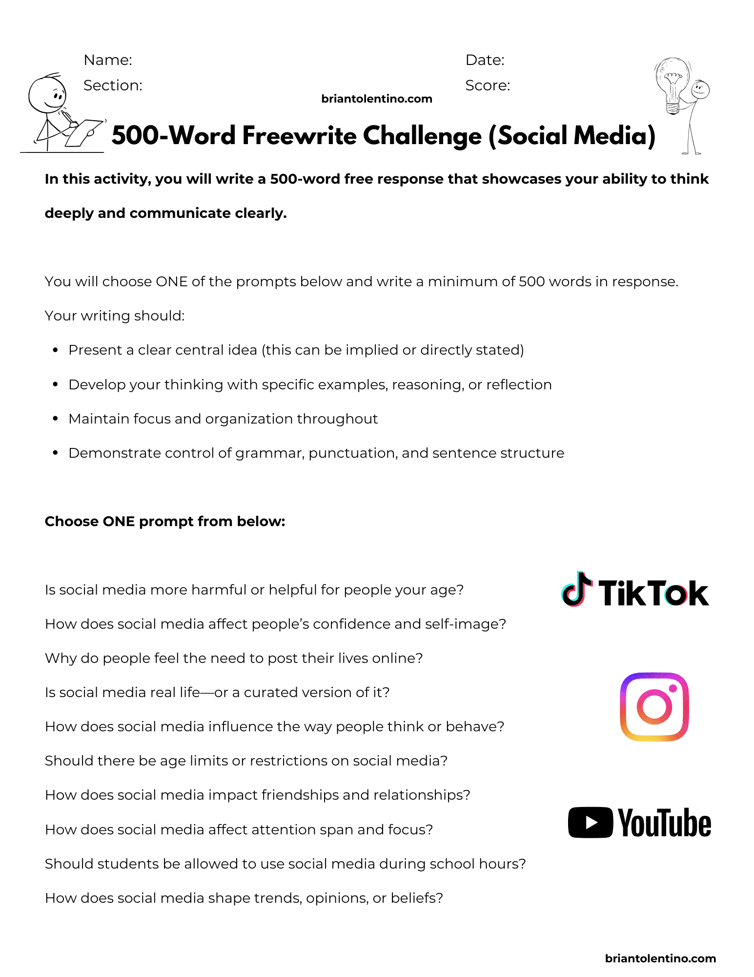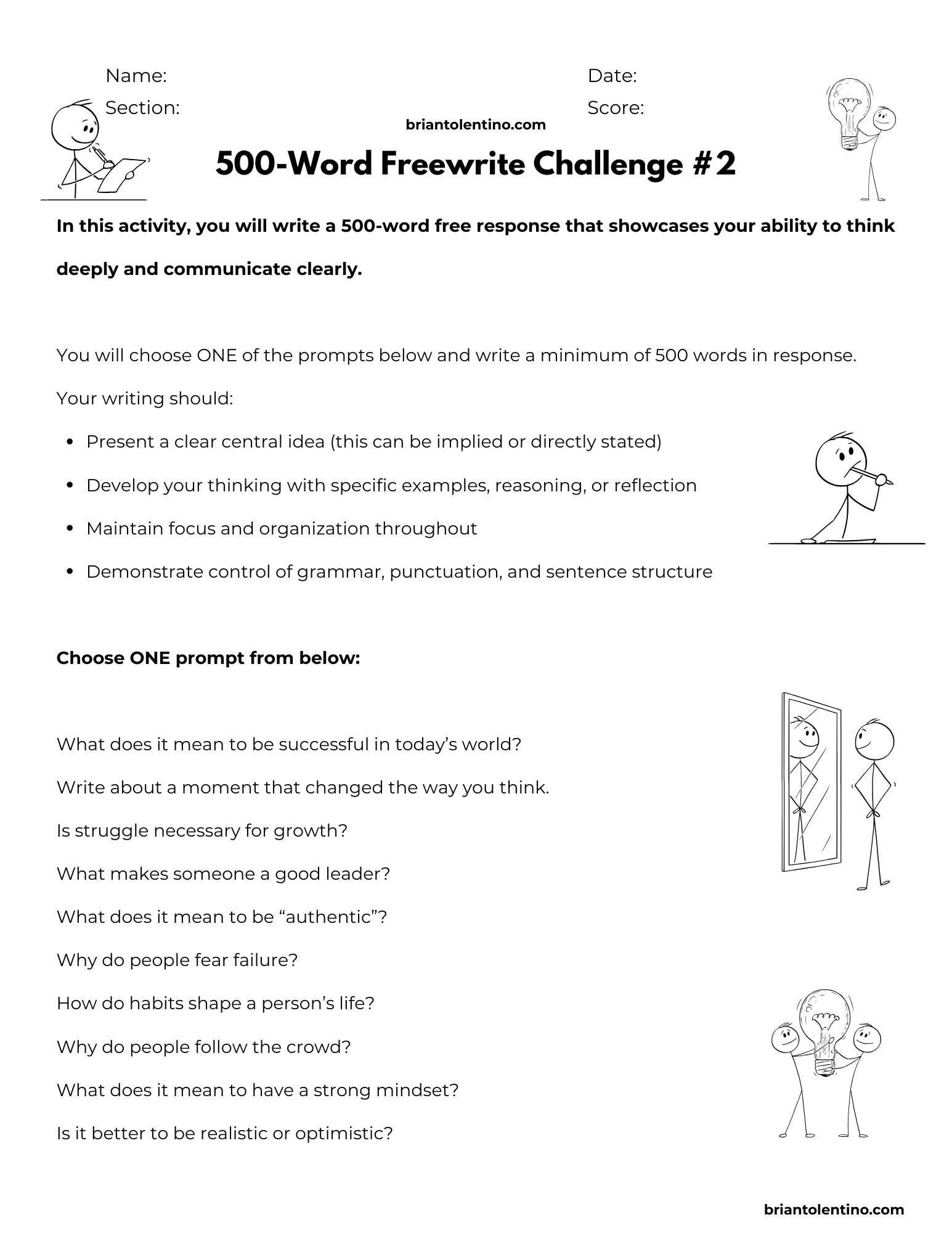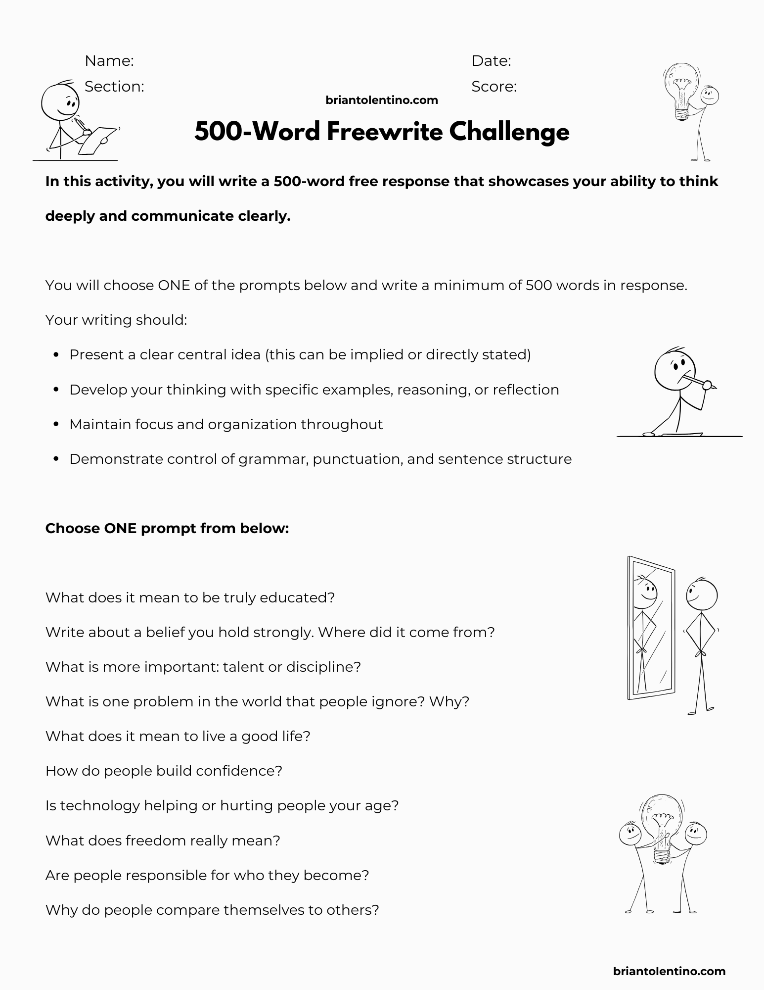 In this activity, you will write a 500-word free response that showcases your ability to think deeply and communicate clearly. You will choose ONE of the prompts below and write a minimum of 500 words in response. Your writing should: Worksheet: