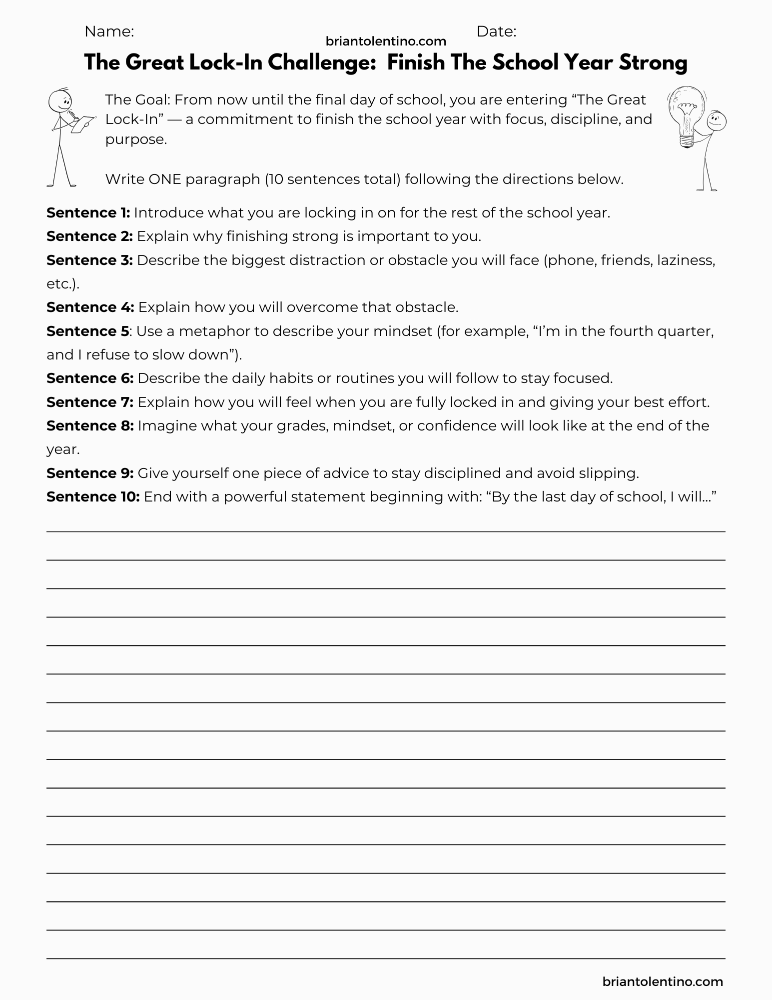 The Goal: From now until the final day of school, you are entering “The Great Lock-In” — a commitment to finish the school year with focus, discipline, and purpose. Worksheet: