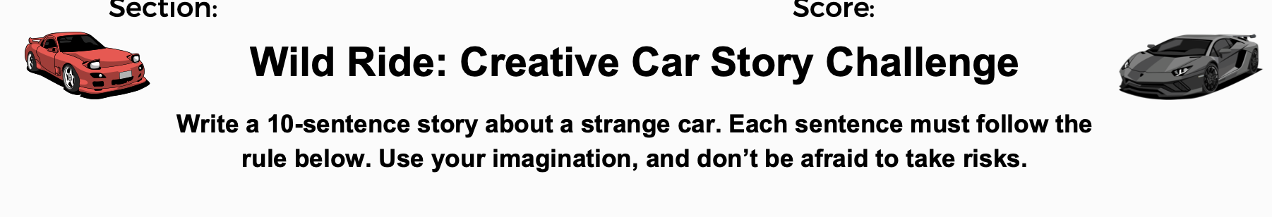 Write a 10-sentence story about a strange car. Each sentence must follow the rule below. Use your imagination, and don’t be afraid to take risks. Worksheet Here: More Writing Challenge Here: Donate Here: