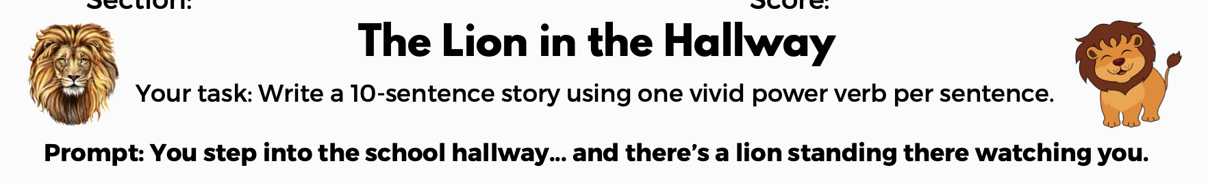 Your task: Write a 10-sentence story using one vivid power verb per sentence. Prompt: You step into the school hallway… and there’s a lion standing there watching you. Donate here: