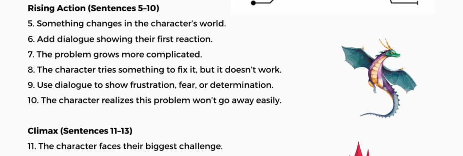 Rules: Write exactly 20 sentences. At least 4 of your sentences must be dialogue (characters talking). Each part of the story should still follow the plot rollercoaster. Worksheet: