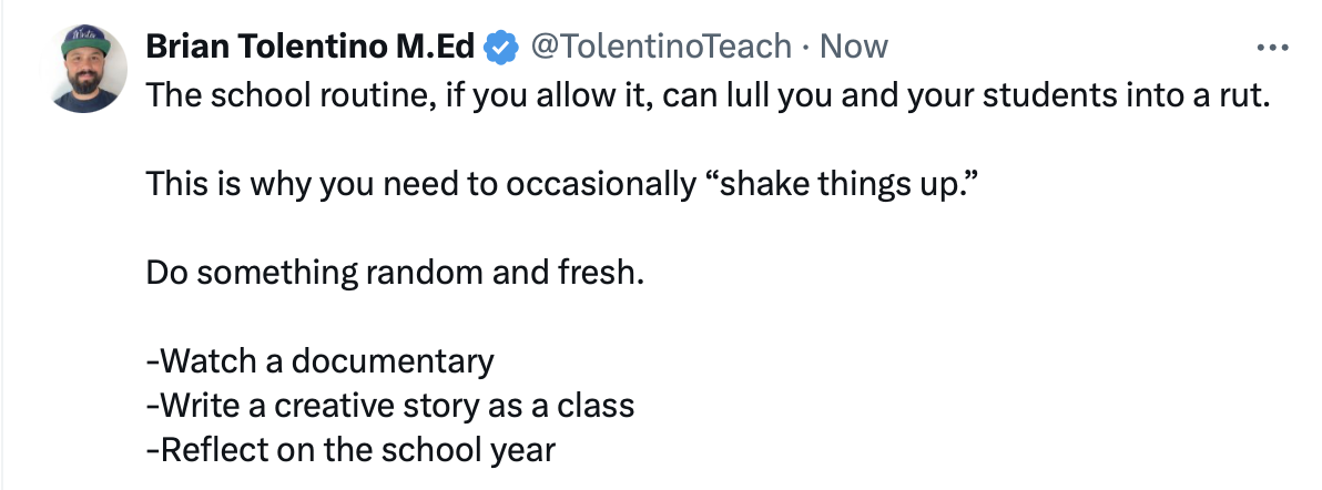 The routine of school brings safety and predictability. These are good things, of course. However, too much monotony combined with the “grind” of teaching can lead to feelings of being in a rut – for both students and teacher. To break the monotony of routine, I like to have a period or school day where I teach something outlandishly different. I want this activity to be random and fresh. For some classes, I do something […]