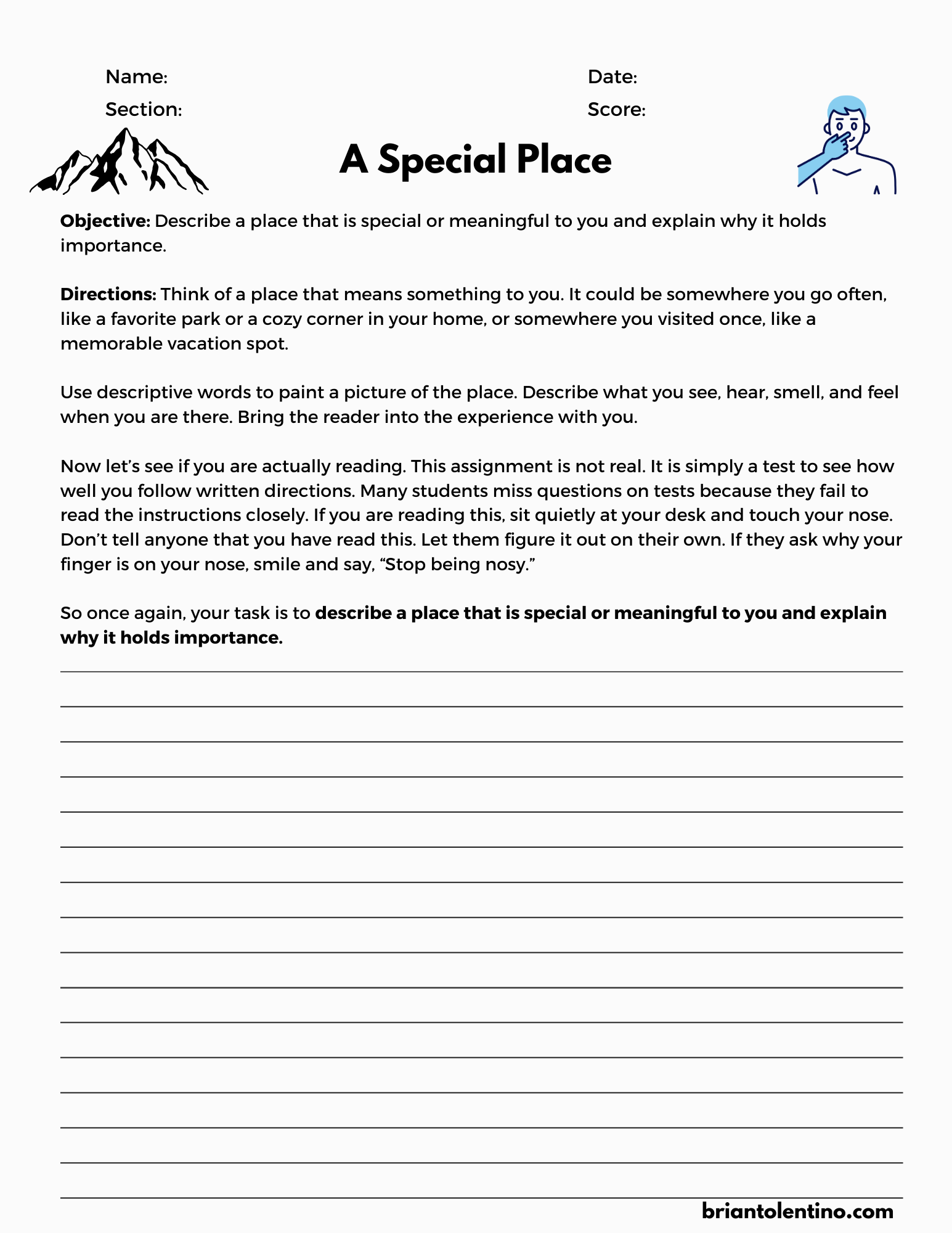 Many of my reluctant readers and writers tend to skim over the instructions in their assignments. This is a bad habit, especially during tests, where missing directions can lead to mistakes. In the following task, I’ve hidden a “secret” statement within the instructions to test if students are truly reading them carefully. The statement reveals that the assignment is fake and tells students to touch their nose. This silly activity has a serious purpose: read […]