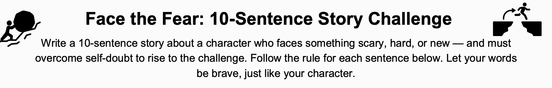 Write a 10-sentence story about a character who faces something scary, hard, or new — and must overcome self-doubt to rise to the challenge. Follow the rule for each sentence below. Let your words be brave, just like your character. More Creative Challenges Here: Donate Here: