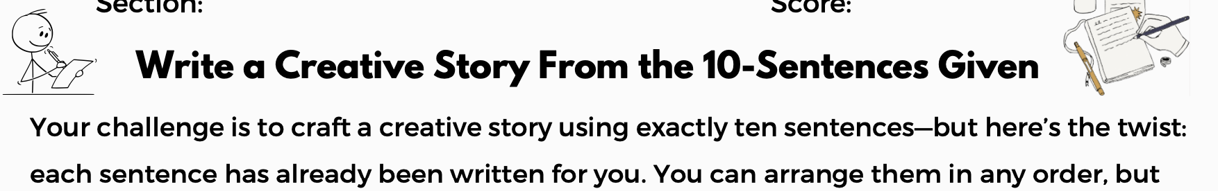 Your challenge is to craft a creative story using exactly ten sentences—but here’s the twist: each sentence has already been written for you. You can arrange them in any order, but they must all be included. Let your imagination lead the way, and make sure your final story is thoughtful, original, and polished. Worksheet: Donate Here: