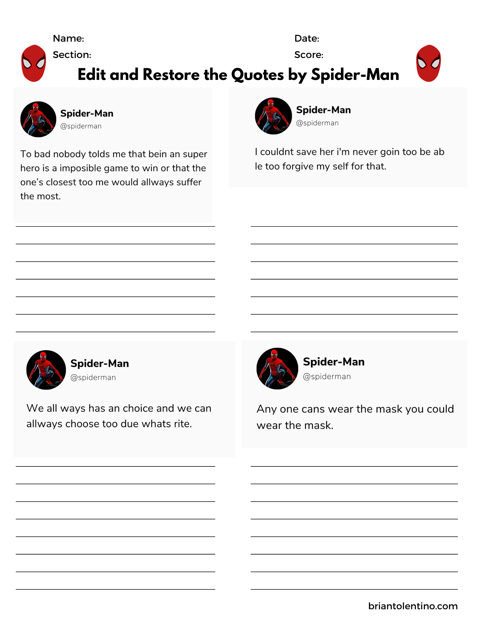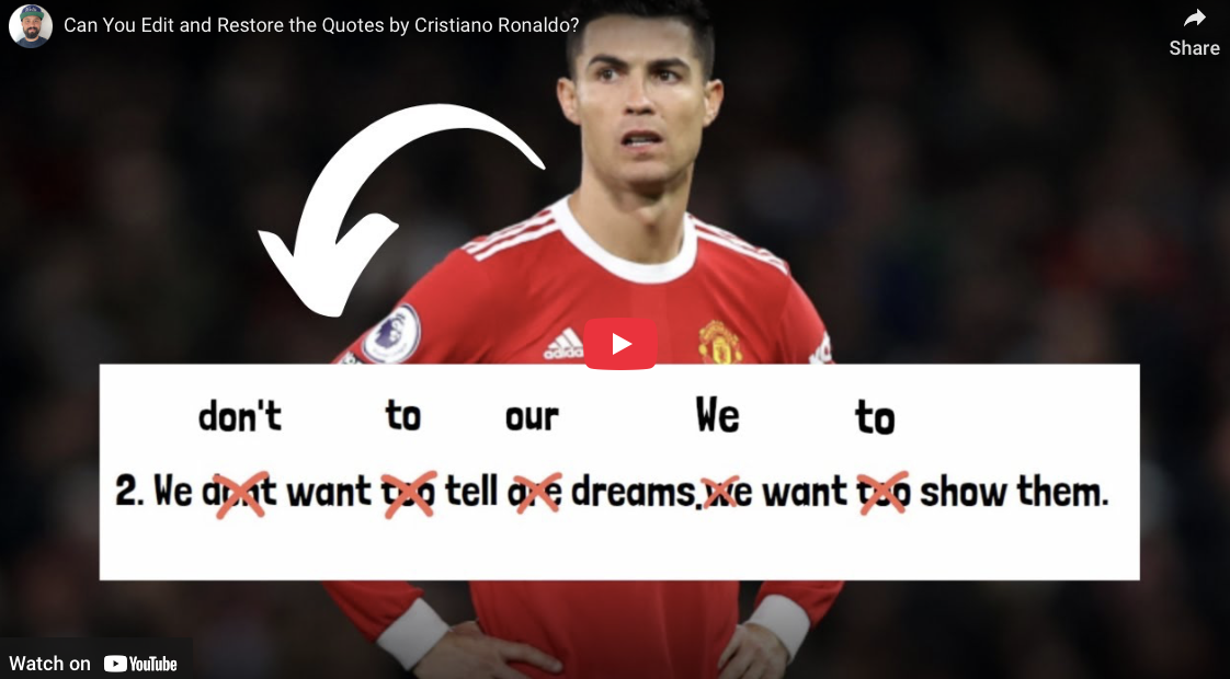 Can your students fix the mistakes in this paragraph? I like to turn this activity into an editing contest. The group that restores the paragraph closest to its original form wins! More Ronaldo activities below: Edit the Quotes Who is better: Messi or Ronaldo? Worksheet: Edit the quotes: edit the quotes #2: Donate Here: