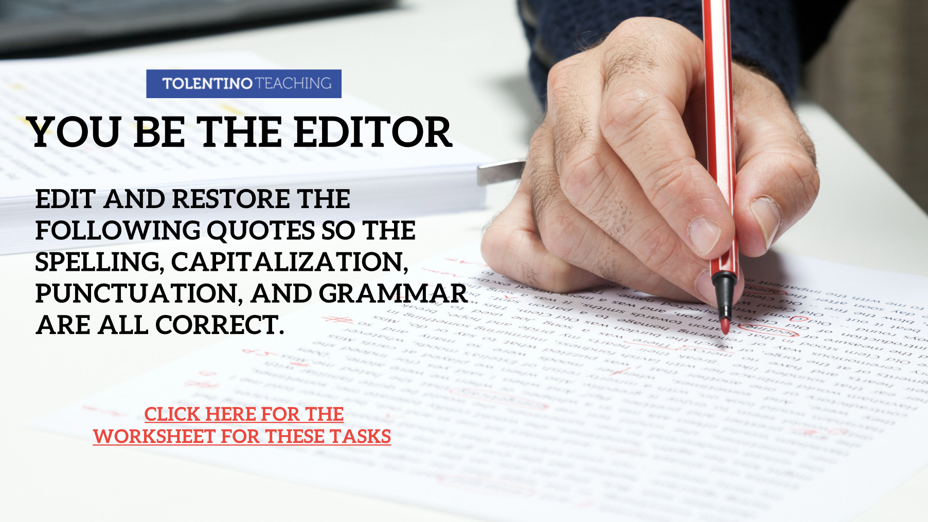 Here is a warm-up activity that I use to get my students acting like editors. The goal is for students to focus on writing conventions (spelling, basic grammar, punctuation, and capitalization). If I can get my students to constantly edit their writing, and ask clarifying questions about language, then I am on the right track. I have discovered that giving five quotes at a time works best (at least for my students). Keeping these activities