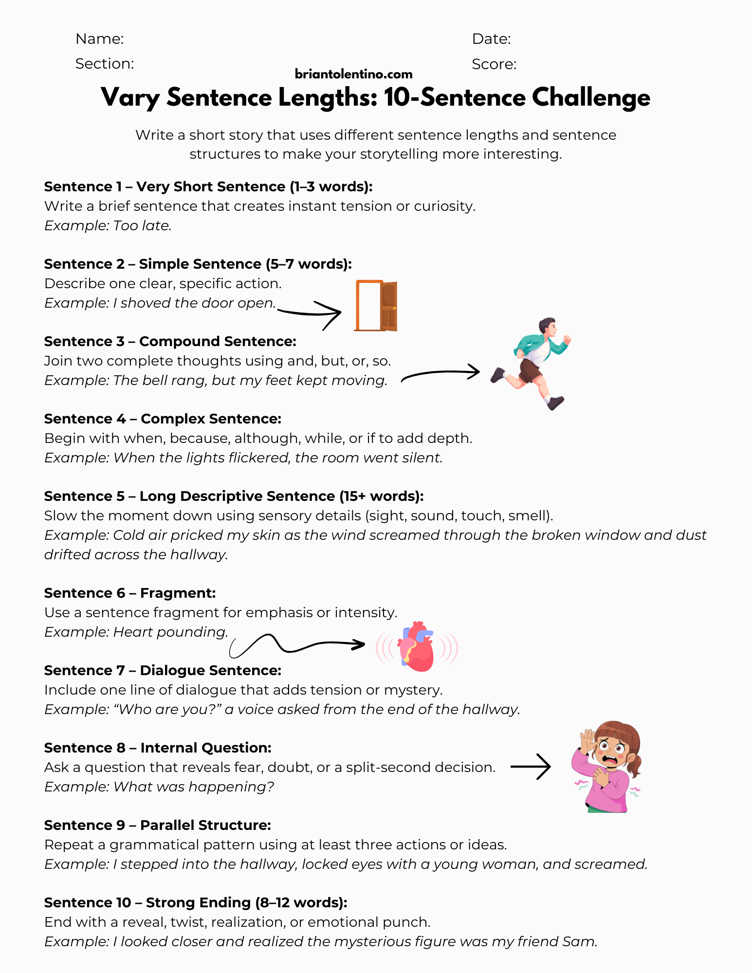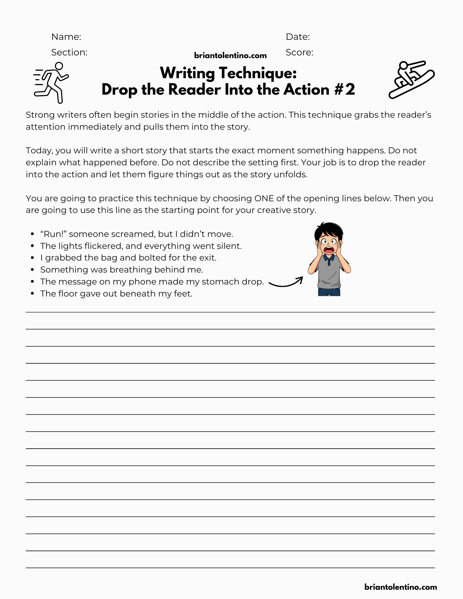 Strong writers often begin stories in the middle of the action. This technique grabs the reader’s attention immediately and pulls them into the story. Today, you will write a short story that starts the exact moment something happens. Do not explain what happened before. Do not describe the setting first. Your job is to drop the reader into the action and let them figure things out as the story unfolds. You are going to practice
