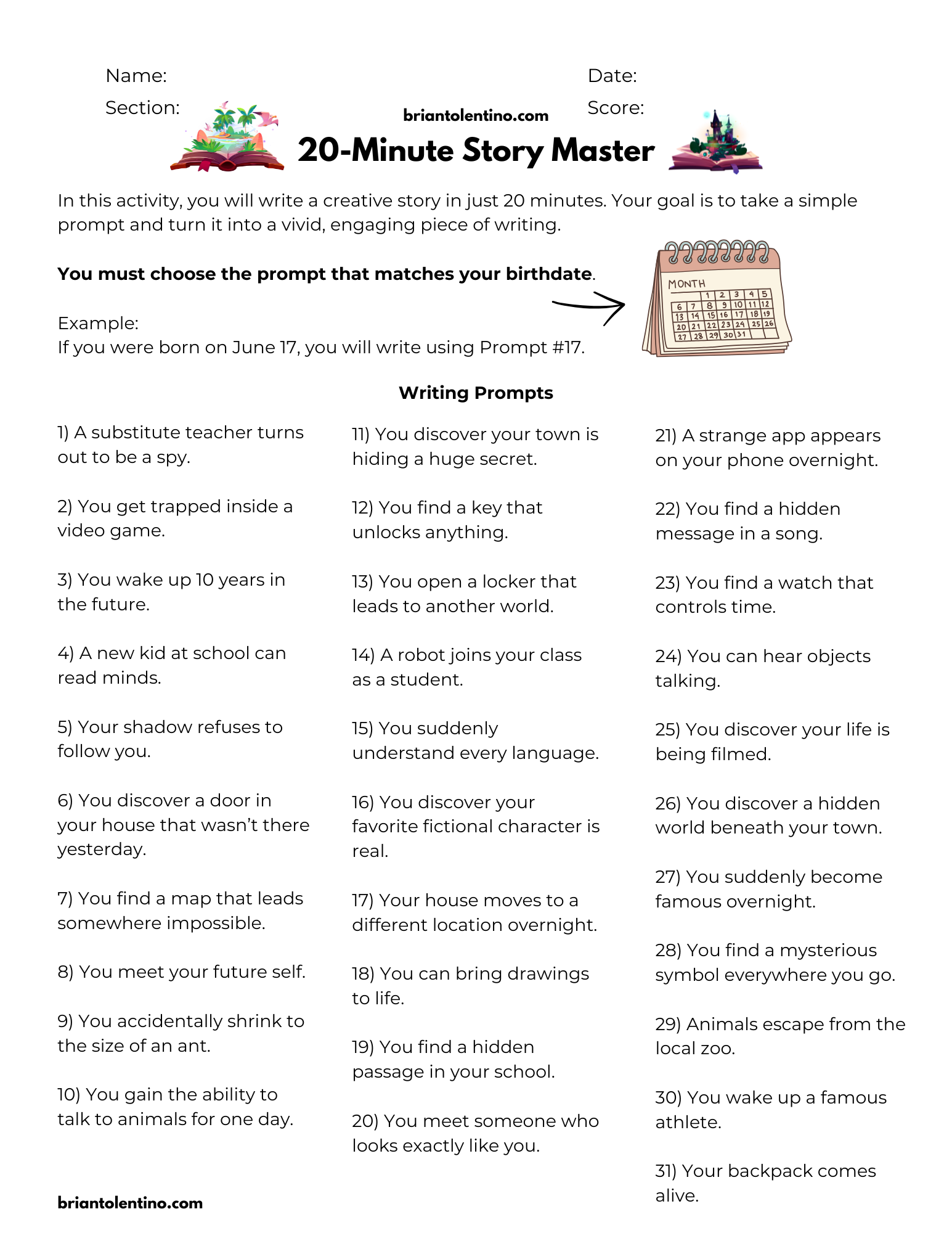In this activity, you will write a creative story in just 20 minutes. Your goal is to take a simple prompt and turn it into a vivid, engaging piece of writing. You must choose the prompt that matches your birthdate. Worksheet: