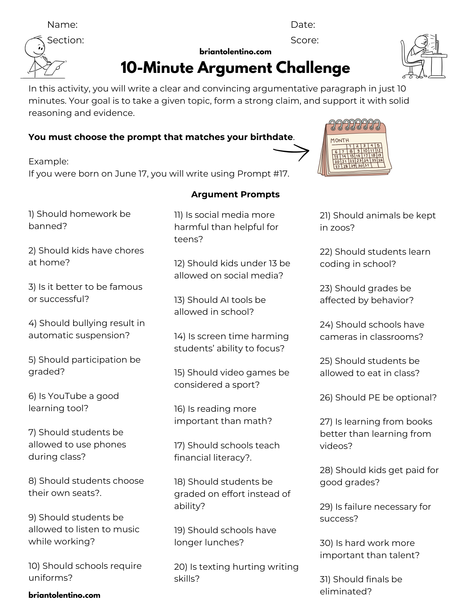 In this activity, you will write a clear and convincing argumentative paragraph in just 10 minutes. Your goal is to take a given topic, form a strong claim, and support it with solid reasoning and evidence. You must choose the prompt that matches your birthdate. Example: If you were born on June 17, you will write using Prompt #17. Worksheet: