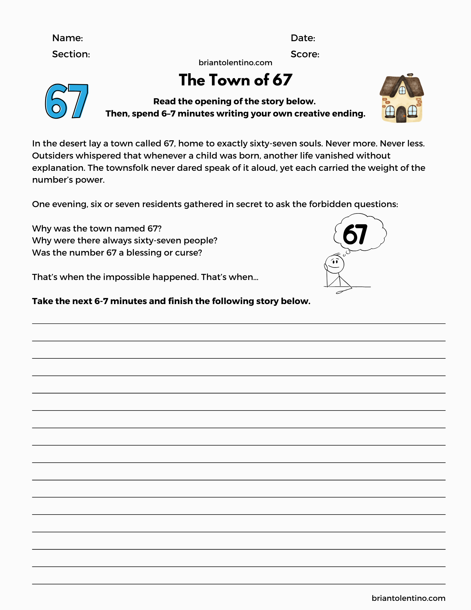 Read the opening of the story below. Then, spend 6–7 minutes writing your own creative ending. Video: