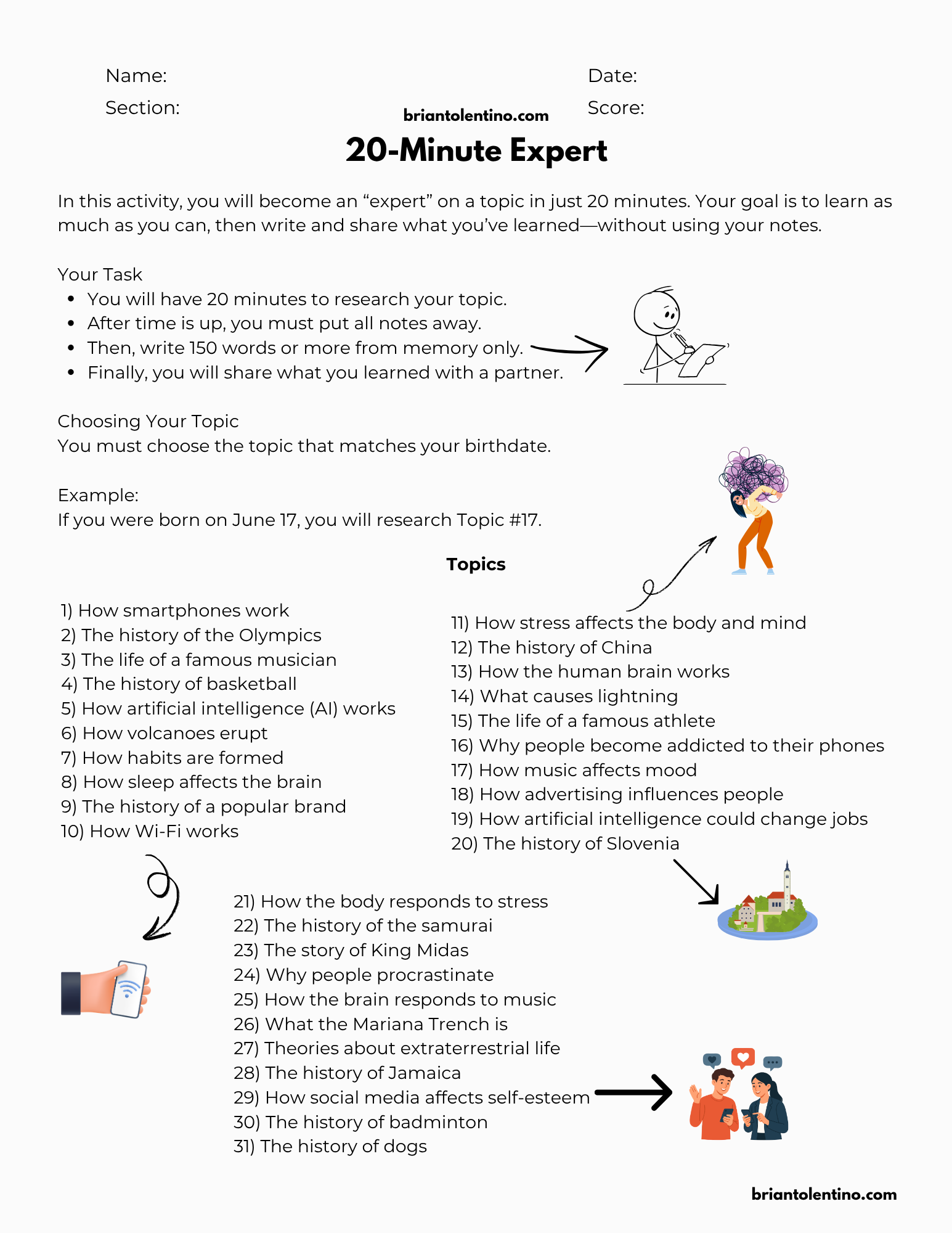In this activity, you will become an “expert” on a topic in just 20 minutes. Your goal is to learn as much as you can, then write and share what you’ve learned—without using your notes. Your Task Choosing Your Topic You must choose the topic that matches your birthdate. Example: If you were born on June 17, you will research Topic #17. Worksheet: