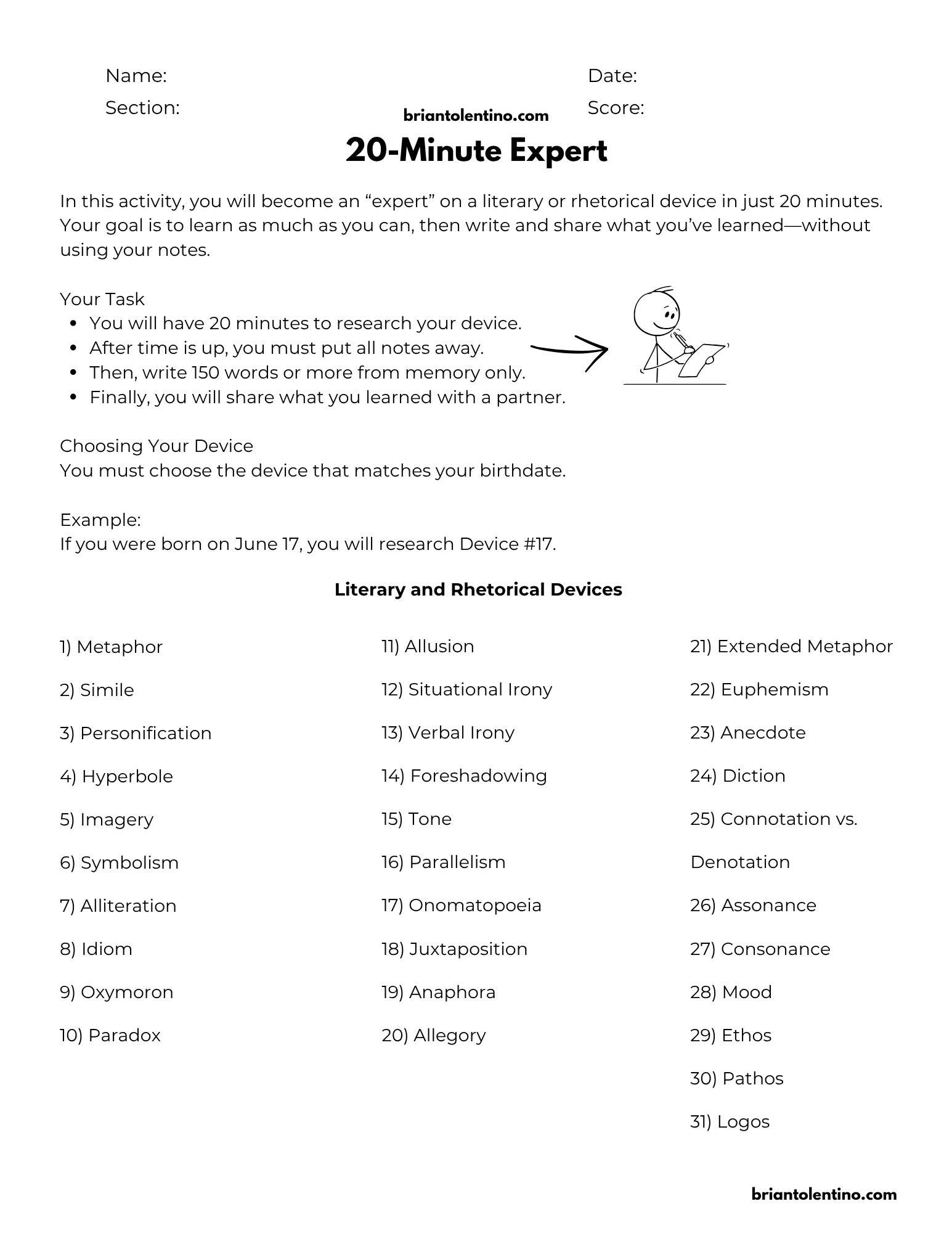 In this activity, you will become an “expert” on a literary or rhetorical device in just 20 minutes. Your goal is to learn as much as you can, then write and share what you’ve learned—without using your notes. Your Task Choosing Your Device You must choose the device that matches your birthdate. Worksheet: