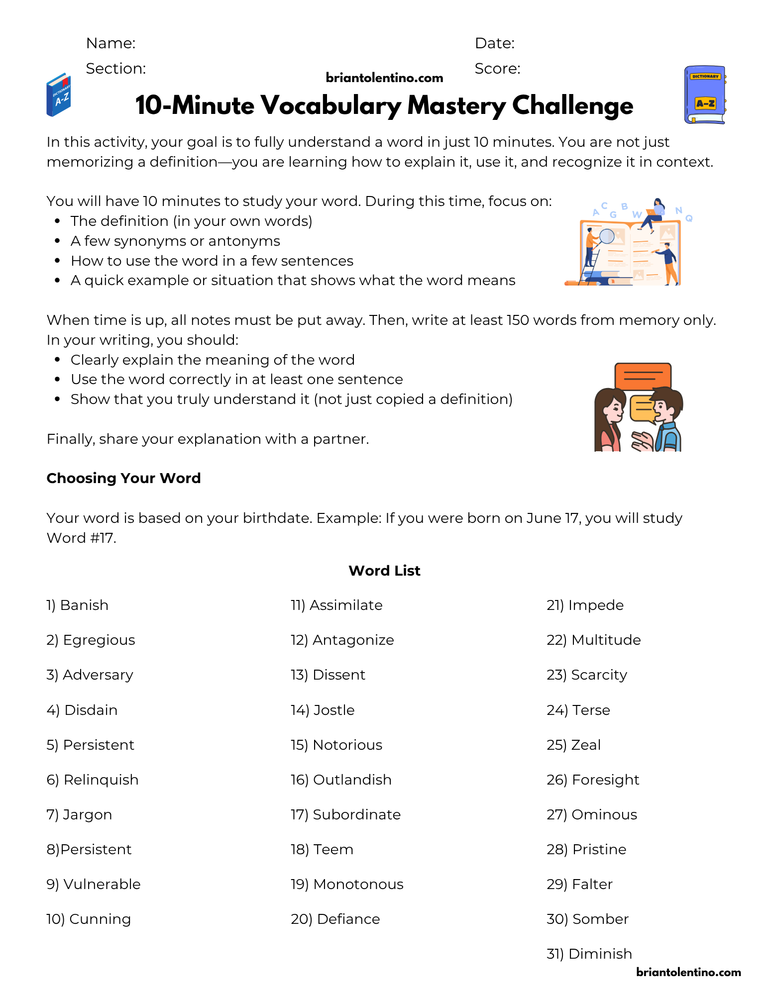 In this activity, your goal is to fully understand a word in just 10 minutes. You are not just memorizing a definition—you are learning how to explain it, use it, and recognize it in context. You will have 10 minutes to study your word. During this time, focus on: When time is up, all notes must be put away. Then, write at least 150 words from memory only. In your writing, you should: Worksheet: Option